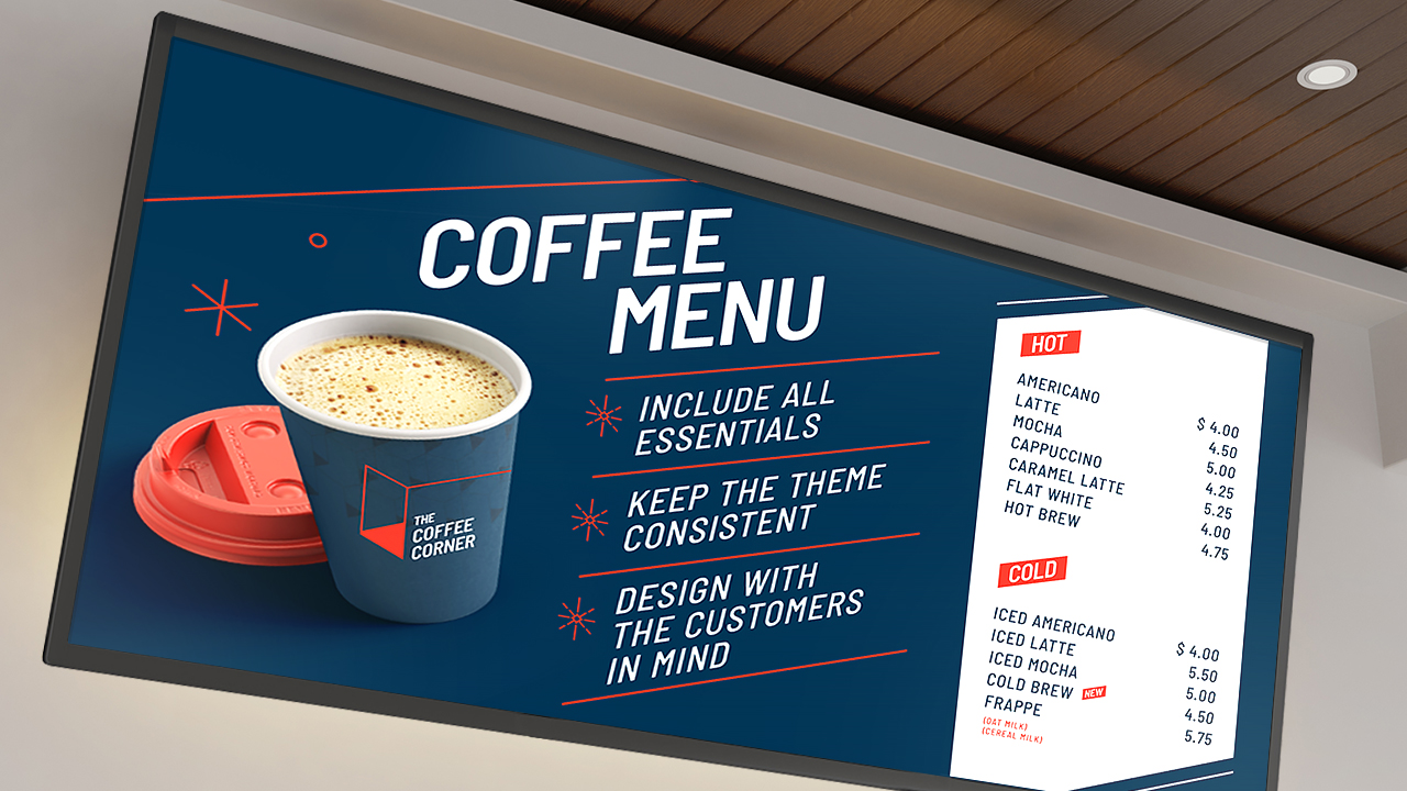 Display new menu items, special deals, or seasonal offers clearly and neatly. If you’re following a theme, stick with consistent colors and design elements so they are straightforward and aligned with your promotion.